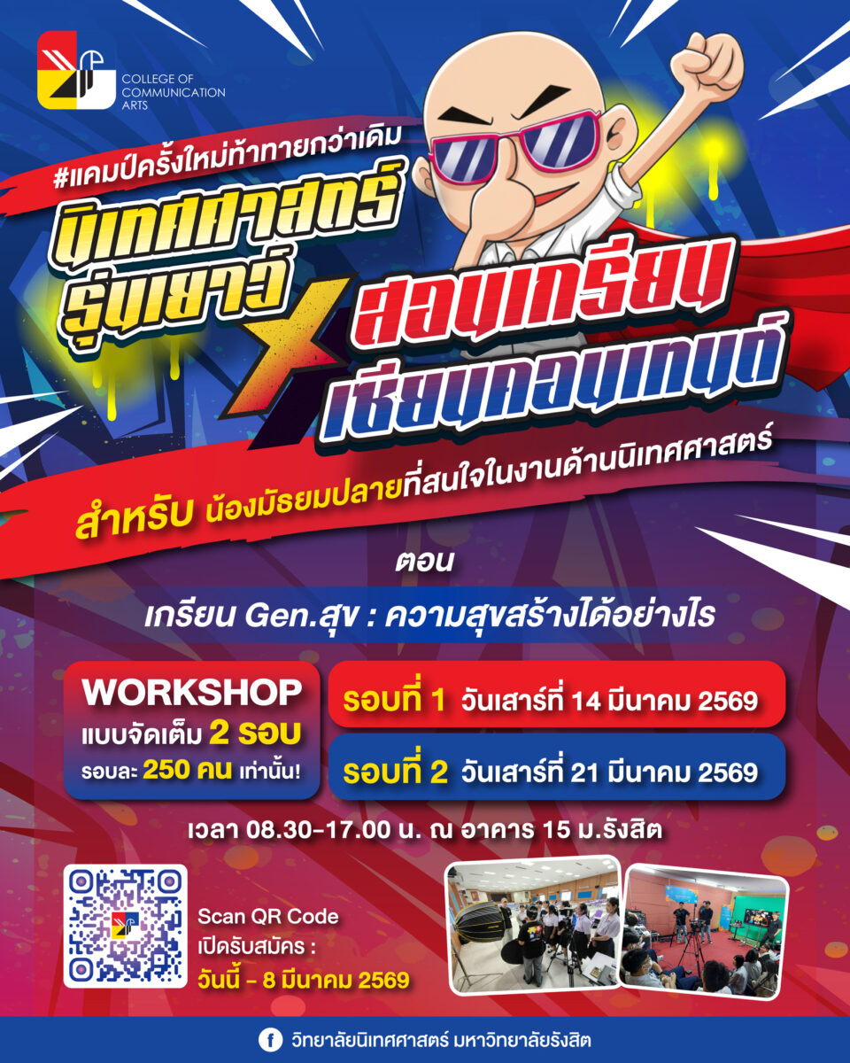 โอกาสมาเเล้ว! ชาวเกรียนอยากเซียนสื่อ ถึงเวลาอัปเลเวล! วิทยาลัยนิเทศศาสตร์ ม.รังสิต ชวนน้องๆ ม.ปลาย มาปลดปล่อยความคิดสร้างสรรค์แบบจัดเต็มในโครงการ สอนเกรียนเซียนคอนเทนต์ X นิเทศศาสตร์รุ่นเยาว์ ตอน “เกรียน Gen.สุข : ความสุขสร้างได้อย่างไร?” ที่น้องๆ ฝึกทำจริง งานนี้ได้ประสบการณ์ใหม่ๆ ได้เพื่อนใหม่สายครีเอทีฟเหมือนกัน เเละได้เกียรติบัตรใส่พอร์ต รับแค่รอบละ 250 คนเท่านั้น! จำนวน 2 รอบ
