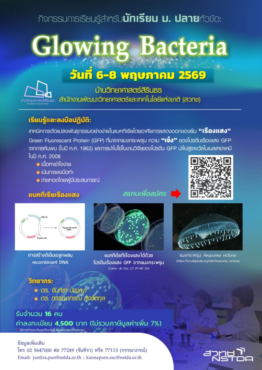 น้อง ๆ จะได้เรียนรู้และฝึกฝนทักษะทางด้านจุลชีววิทยาประยุกต์และชีววิทยา/พันธุศาสตร์ระดับโมเลกุลทั้งภาคทฤษฎีและภาคปฏิบัติด้วยตนเองในห้องปฏิบัติการของบ้านวิทยาศาสตร์สิรินธร ภายใต้การดูแลของคณะนักวิชาการ สวทช. โดยเรียนรู้เกี่ยวกับการสร้างแบคทีเรียเรืองแสงที่มียีน Green fluorescent protein (GFP) ด้วยเทคนิคพันธุศาสตร์โมเลกุล ซึ่งน้อง ๆ จะเรียนรู้ในหัวข้อต่างๆ ได้แก่ การค้นพบโปรตีนเรืองแสง (GFP) และการประยุกต์ใช้ การเพิ่มจำนวนดีเอ็นเอด้วยปฏิกิริยาลูกโซ่พอลิเมอเรส (Polymerase Chain Reaction, PCR) การสร้างแบคทีเรียดัดแปลงพันธุกรรมอย่างง่าย การตรวจหาแบคทีเรียที่รับเอาดีเอ็นเอลูกผสมด้วยวิธี Colony PCR การแยกดีเอ็นเอด้วยกระแสไฟฟ้าด้วยเทคนิค Gel electrophoresis การตรวจผล Colony PCR โดย Gel electrophoresis การเตรียมพลาสมิดดีเอ็นเอ การตัดพลาสมิดดีเอ็นเอด้วยเอนไซม์ตัดจำเพาะ และการตรวจผลการตัดพลาสมิดโดย Gel electrophoresis
