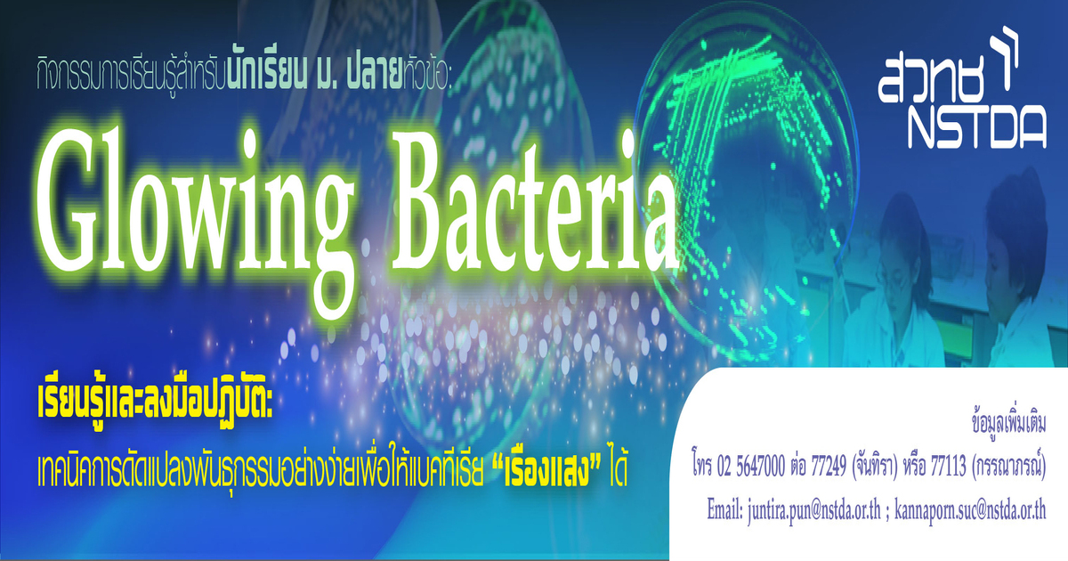 น้อง ๆ จะได้เรียนรู้และฝึกฝนทักษะทางด้านจุลชีววิทยาประยุกต์และชีววิทยา/พันธุศาสตร์ระดับโมเลกุลทั้งภาคทฤษฎีและภาคปฏิบัติด้วยตนเองในห้องปฏิบัติการของบ้านวิทยาศาสตร์สิรินธร ภายใต้การดูแลของคณะนักวิชาการ สวทช. โดยเรียนรู้เกี่ยวกับการสร้างแบคทีเรียเรืองแสงที่มียีน Green fluorescent protein (GFP) ด้วยเทคนิคพันธุศาสตร์โมเลกุล ซึ่งน้อง ๆ จะเรียนรู้ในหัวข้อต่างๆ ได้แก่ การค้นพบโปรตีนเรืองแสง (GFP) และการประยุกต์ใช้ การเพิ่มจำนวนดีเอ็นเอด้วยปฏิกิริยาลูกโซ่พอลิเมอเรส (Polymerase Chain Reaction, PCR) การสร้างแบคทีเรียดัดแปลงพันธุกรรมอย่างง่าย การตรวจหาแบคทีเรียที่รับเอาดีเอ็นเอลูกผสมด้วยวิธี Colony PCR การแยกดีเอ็นเอด้วยกระแสไฟฟ้าด้วยเทคนิค Gel electrophoresis การตรวจผล Colony PCR โดย Gel electrophoresis การเตรียมพลาสมิดดีเอ็นเอ การตัดพลาสมิดดีเอ็นเอด้วยเอนไซม์ตัดจำเพาะ และการตรวจผลการตัดพลาสมิดโดย Gel electrophoresis