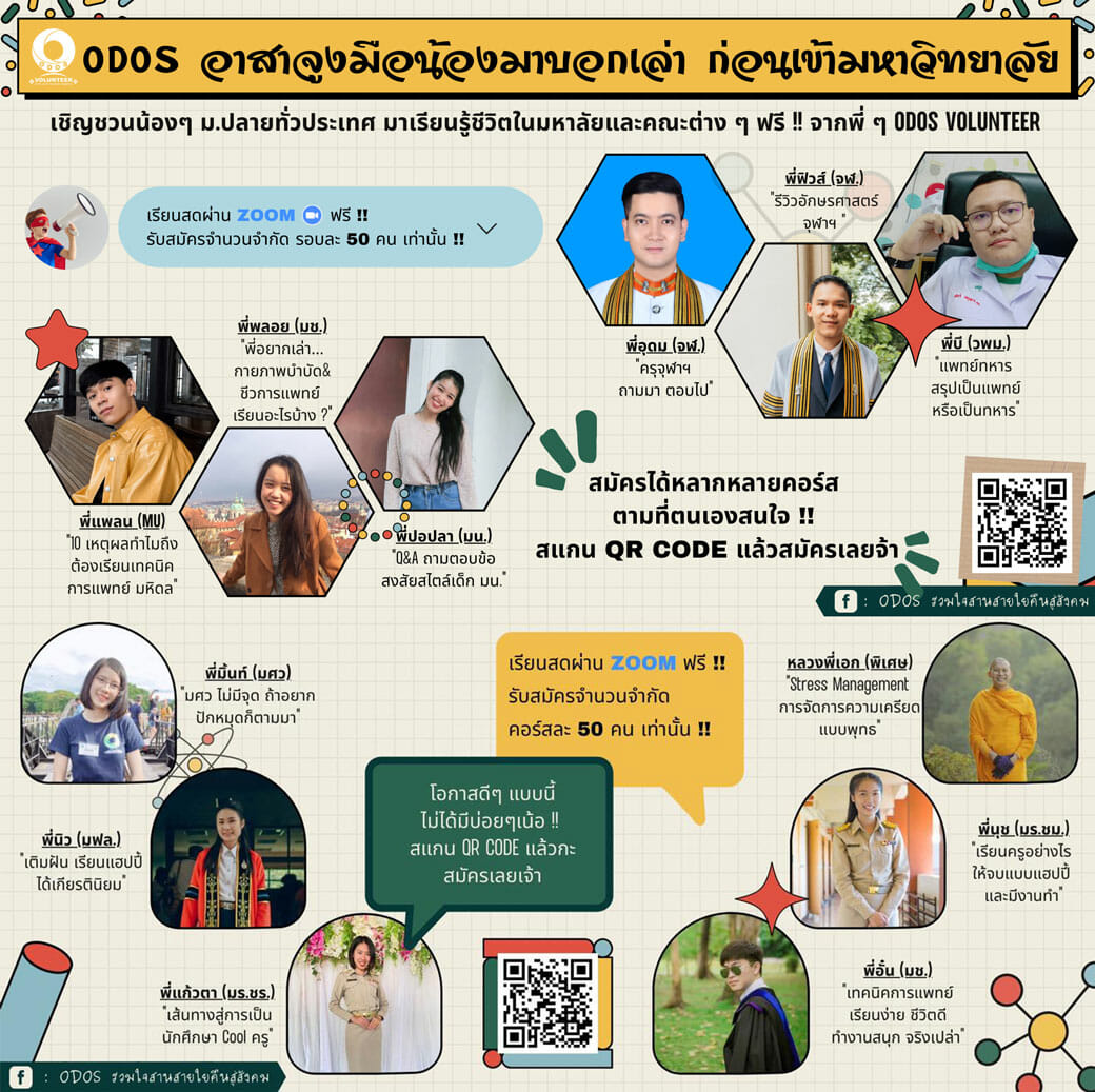 ODOS VOLUNTEER จัดโครงการ 🔅ODOS อาสา จูงมือน้องมาบอกเล่า ก่อนเข้ามหาวิทยาลัย🔅 สำหรับน้อง ๆ ที่สนใจอยากเรียนรู้เกี่ยวกับการเตรียมตัวเข้ามหาวิทยาลัย การเรียนและใช้ชีวิตในระดับมหาวิทยาลัย และทางเลือกหลังจบการศึกษา โดยพี่ ๆ วิทยากรอาสาที่จบจากมหาลัยและคณะนั้น ๆ โดยตรง