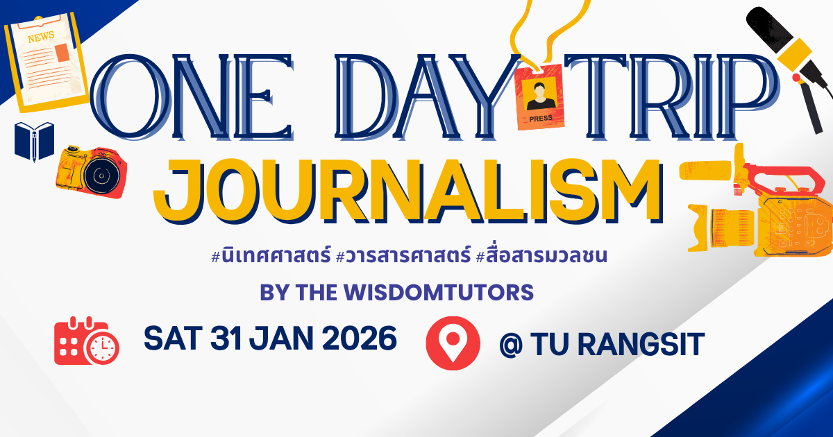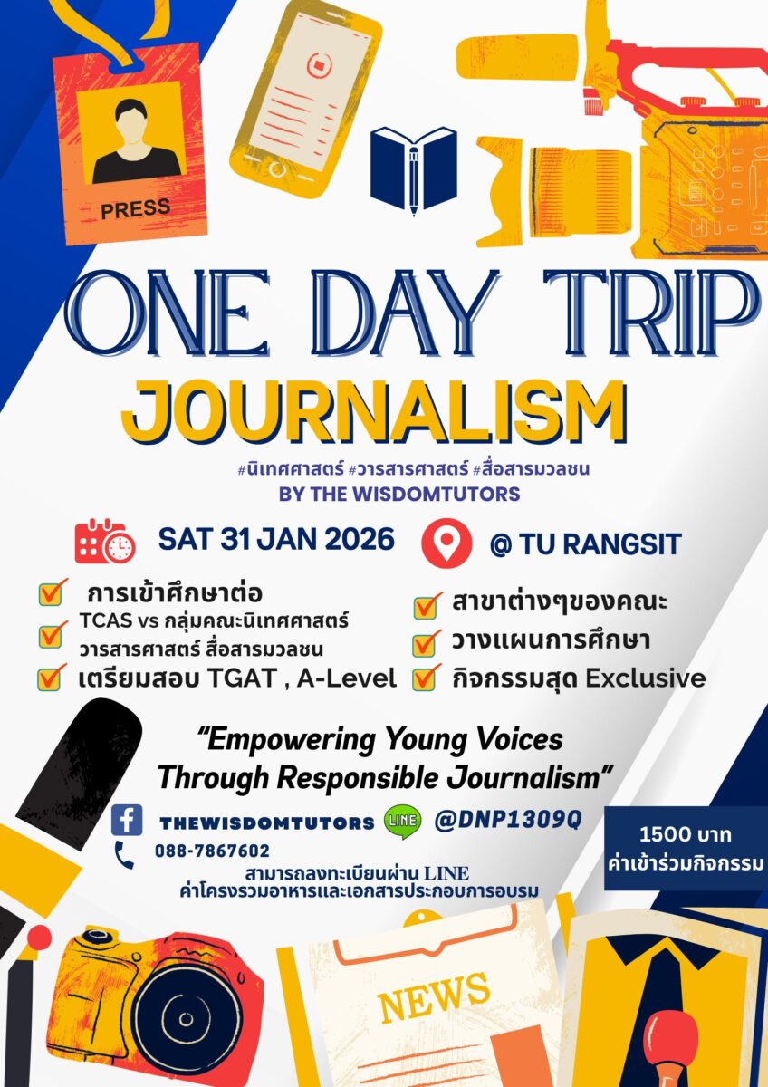 ONE DAY TRIP JOURNALISM จัดขึ้นเพื่อเปิดโอกาสให้นักเรียนมัธยมปลายและผู้สนใจสาย นิเทศศาสตร์ – วารสารศาสตร์ – สื่อสารมวลชน ได้เรียนรู้การทำงานของคนเบื้องหน้าและเบื้องหลังสื่อ ผ่านการบรรยายเชิงลึกและกิจกรรมเชิงปฏิบัติการ (Workshop) จากพี่ ๆ และผู้เชี่ยวชาญในวงการสื่อมืออาชีพ ผู้เข้าร่วมจะได้เรียนรู้ตั้งแต่พื้นฐานแนวคิดวารสารศาสตร์ การผลิตข่าว การสื่อสารอย่างรับผิดชอบ ไปจนถึงการใช้สื่อสร้างแรงบันดาลใจและการเปลี่ยนแปลงทางสังคม พร้อม Workshop ฝึกคิด ฝึกพูด ฝึกเขียน และสร้างสื่อจริงในวันเดียว!