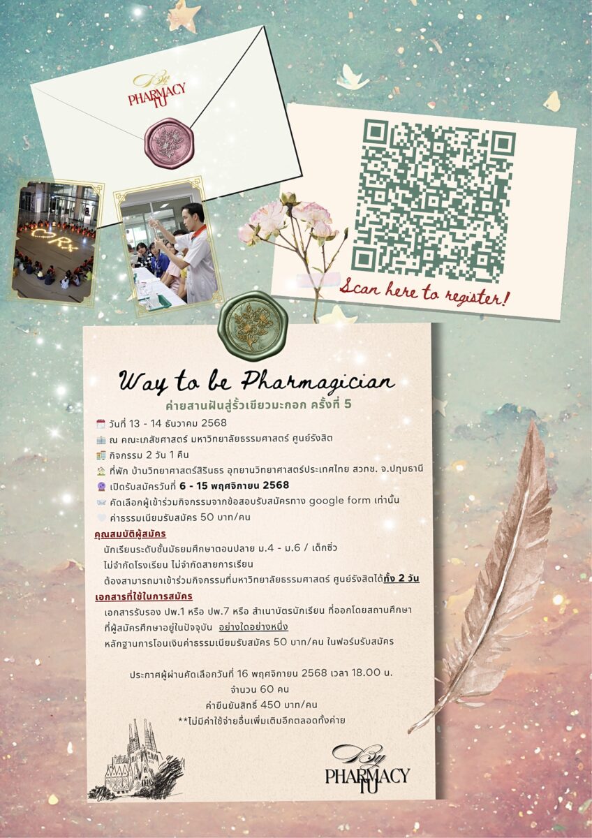 💥 มาร่วมสนุกด้วยกัน เริ่มสมัครได้แล้ววันนี้! อย่าพลาดที่จะคว้าประสบการณ์ดี ๆ แล้วเจอกันที่คณะเภสัชศาสตร์ มหาวิทยาธรรมศาสตร์💛❤️