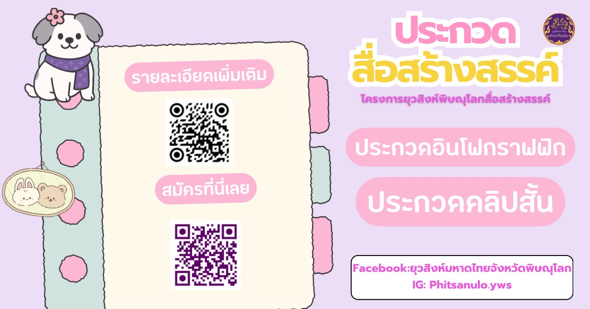 คลิปนำเสนอประเพณีและวัฒนธรรมหรือสถานที่ท่องเที่ยวของจังหวัดพิษณุโลก หรือนำเสนอแนวคิดใหม่ ๆ ที่ช่วยพัฒนาพิษณุโลกอย่างสร้างสรรค์ (ไม่มีรูปแบบกำหนด สามารถใช้ความคิดสร้างสรรค์ได้อย่างอิสระ)