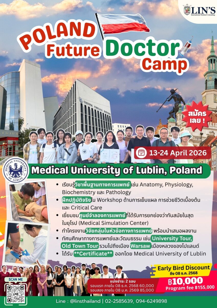 ที่นี่ น้อง ๆ จะได้เรียนกับ อาจารย์แพทย์จาก Medical University of Lublin ติดอันดับท็อป 10 มหาวิทยาลัยแพทย์ในโปแลนด์ และได้เรียนในห้องเรียนของนักศึกษาแพทย์จริง ๆ เข้าใจพื้นฐานการเรียนแพทย์ของยุโรปจริง ๆ