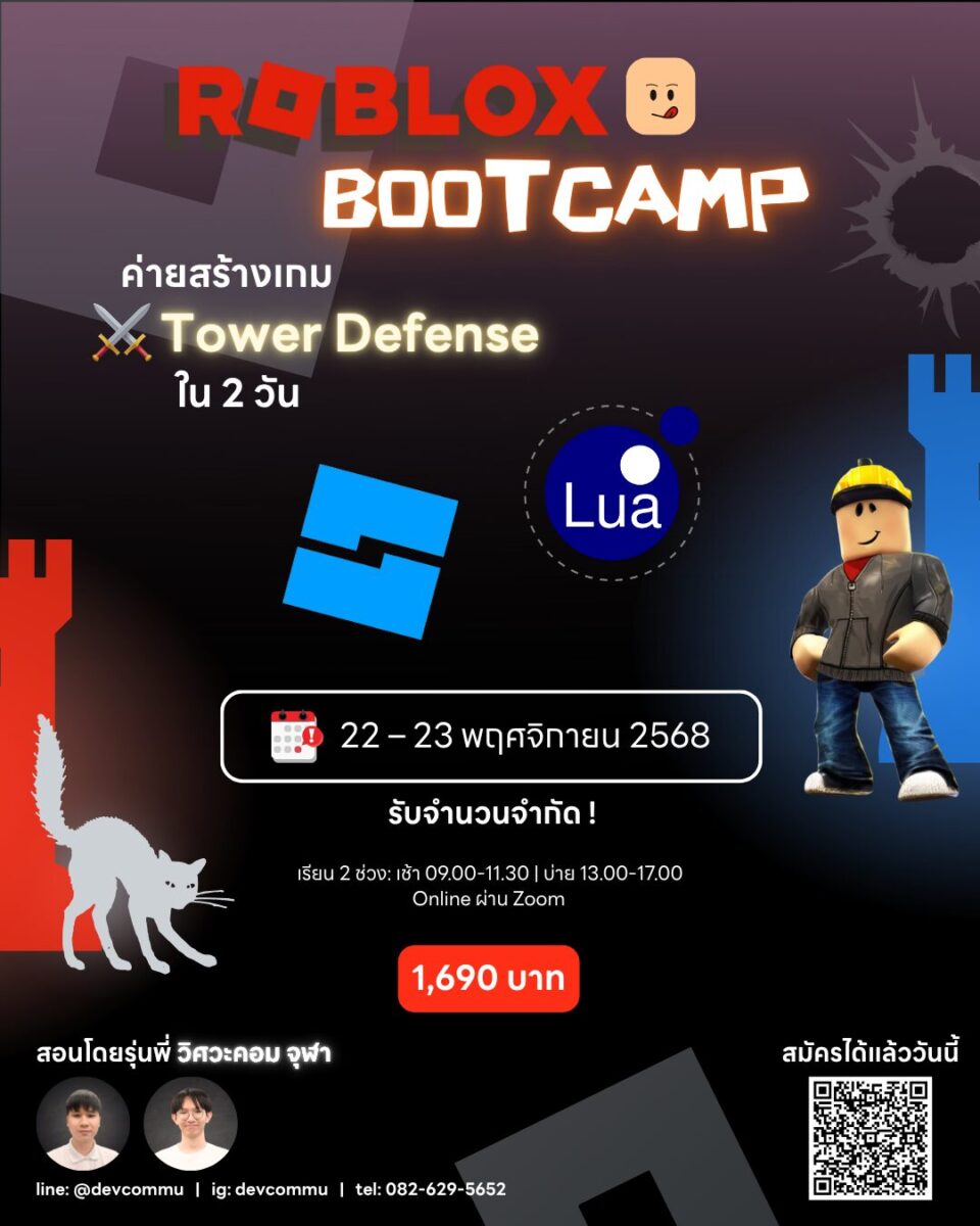 2 วันเต็ม! ปูพื้นฐานการสร้างเกมใน Roblox Studio ด้วยภาษา Lua พร้อม Workshop ลงมือสร้างเกมแนว Tower Defense ตั้งแต่เริ่มต้น ไปจนถึงปล่อยเกมให้เล่นได้จริง