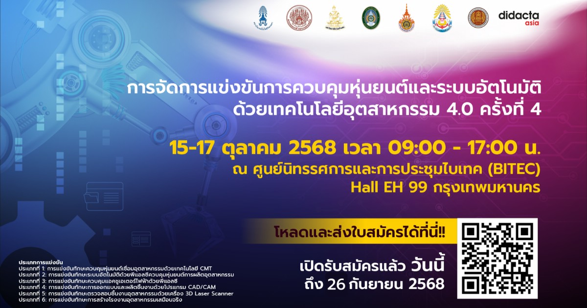 การแข่งขันควบคุมหุ่นยนต์และระบบอัตโนมัติฯ จะจัดขึ้นภายในงานนิทรรศการการศึกษา didacta asia 2025 เพื่อยกระดับทักษะการเรียนรู้ด้านหุ่นยนต์และอัตโนมัติในยุคดิจิทัล สร้างประสบการณ์จริงให้กับนักศึกษาอาชีวศึกษาและอุดมศึกษา ครู โค้ช และอาจารย์ที่ปรึกษา
