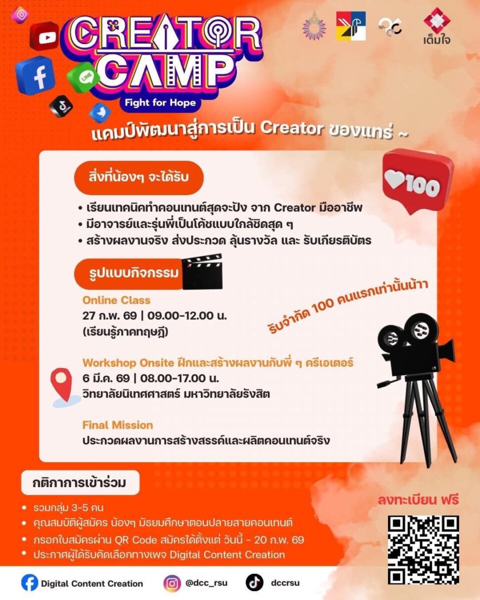 อยากเป็น Creator ต้องมาแคมป์นี้! Creator Camp แคมป์พัฒนาสู่การเป็นครีเอเตอร์ตัวจริง สาขาวิชาการสร้างสรรค์คอนเทนต์ดิจิทัล วิทยาลัยนิเทศศาสตร์ มหาวิทยาลัยรังสิต ชวนน้อง ม.ปลาย เข้าร่วมกิจกรรม ชวนมาอัปสกิลทำคอนเทนต์ให้ปัง มีอาจารย์ + พี่ครีเอเตอร์โค้ชใกล้ชิด