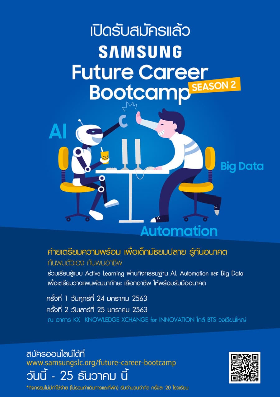 เตรียมพบกับ Samsung Future Career Bootcamp #SEASON2 ค่ายเตรียมความพร้อมเพื่อเด็กมัธยมปลาย รู้ทันอนาคต ค้นพบตัวเอง ค้นพบอาชีพ มาร่วมถอดรหัส AI – Automation – Big Data พร้อมวางแผนรับมืออนาคต ด้วยประสบการณ์เรียนรู้แบบ Active Learning !