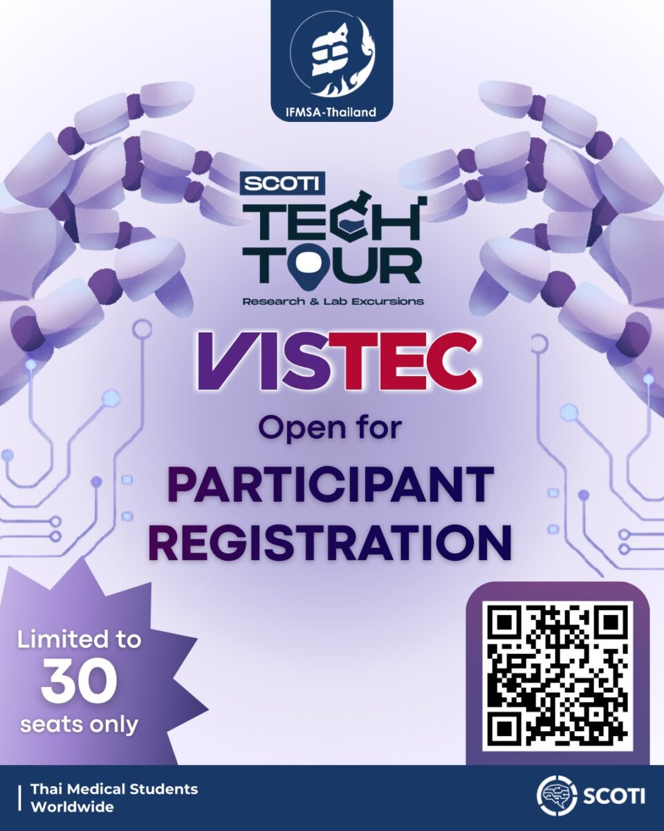 ขอเชิญเพื่อน ๆ นิสิต/นักศึกษาแพทย์ และนักเรียนนักศึกษาที่มีความสนใจด้านเทคโนโลยี มาร่วมเปิดประสบการณ์สุดล้ำกับทริปตะลุยห้องแล็บวิจัยระดับโลกที่ VISTEC (สถาบันวิทยสิริเมธี)