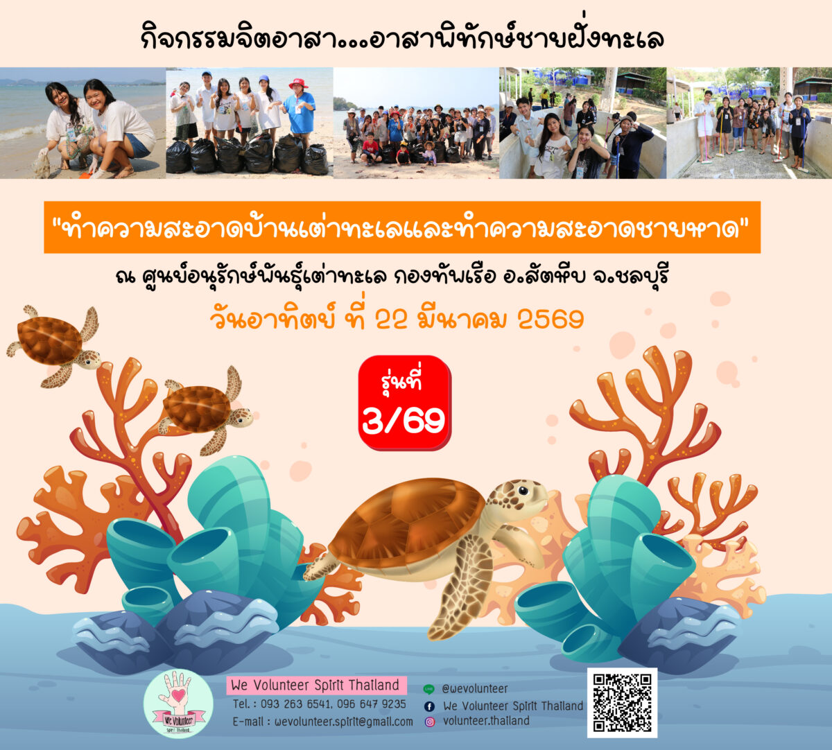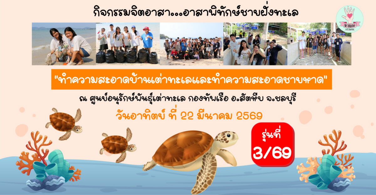 💝💞 We Volunteer Spirit Thailand ร่วมกับทีมเครือข่ายพันธมิตร ขอเชิญชวนน้องๆ เข้าร่วมกิจกรรม “อาสาพิทักษ์ชายฝั่งทะเล (ทำความสะอาดบ้านเต่าทะเล + ทำความสะอาดชายหาด) 🐢🐢 อ.สัตหีบ จ.ชลบุรี