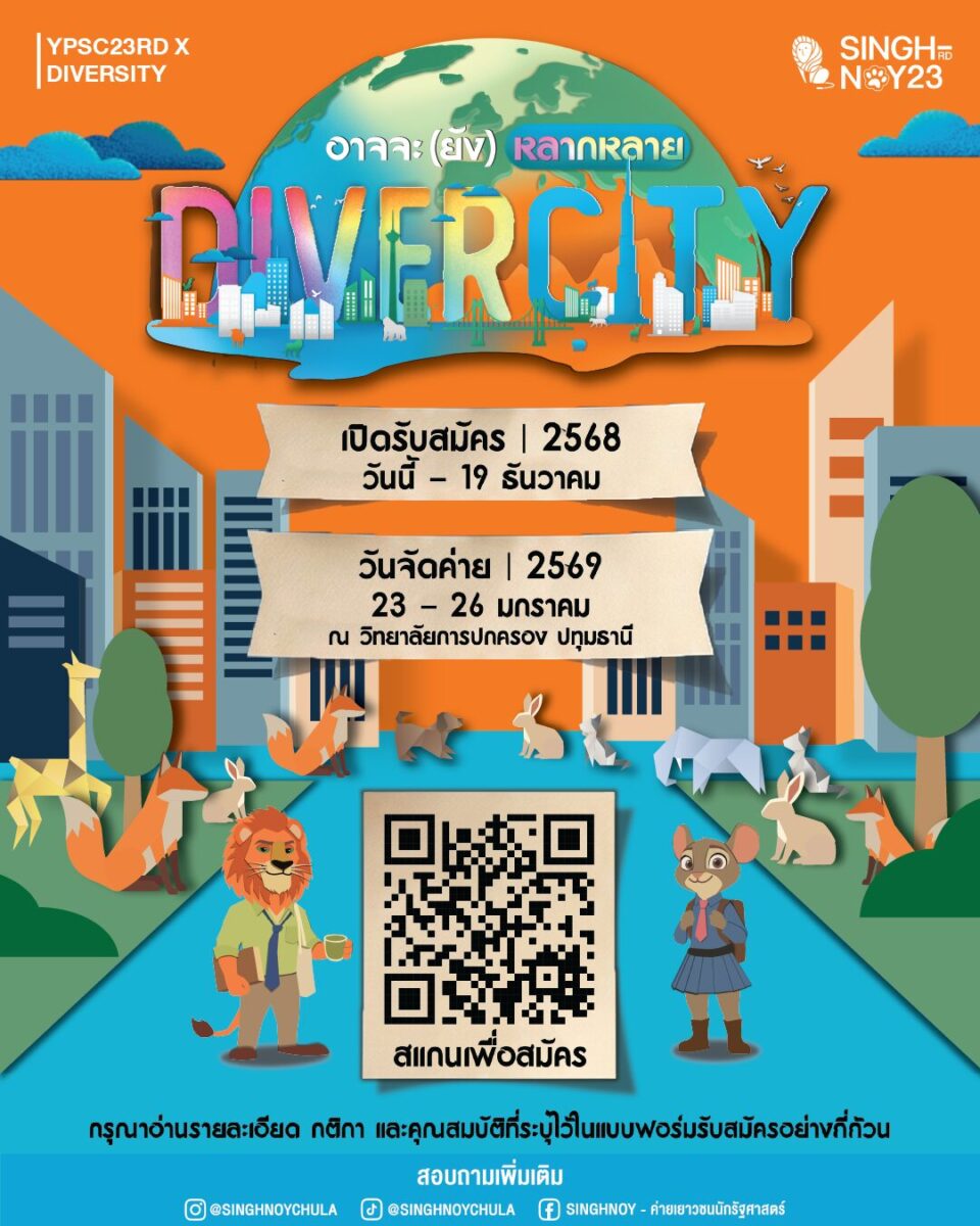ค่ายเยาวชนนักรัฐศาสตร์ในปีนี้ พวกเราจะพาสิงห์น้อยทุกคนไปเรียนรู้เกี่ยวกับอัตลักษณ์ที่หลากหลายในสังคมของเรา รวมถึงสเปกตรัมทางการเมืองและการรู้เท่าทันสื่อ ภายใต้ธีม ‘DiverCity อาจจะ (ยัง) หลากหลาย’ เพื่อสร้างความตระหนักว่าถึงแม้พวกเราจะมีความเชื่อ อุดมการณ์ เชื้อชาติ หรือสีผิวที่แตกต่างกัน แต่พวกเราก็สามารถอยู่ร่วมกันในสังคมได้
