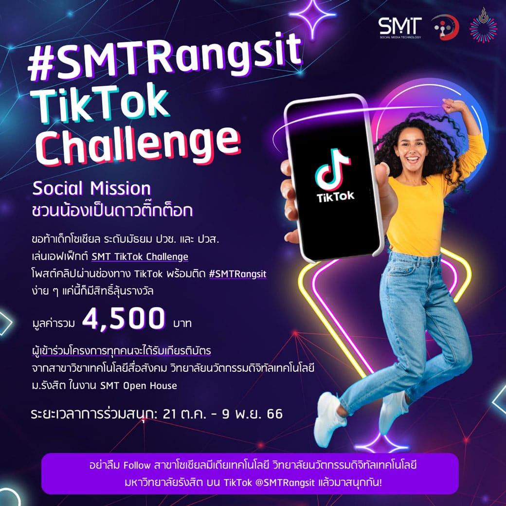 - เล่นเอฟเฟ็กต์ SMT TikTok Challenge บนช่องทาง TikTok @smtrangsit หรือกดผ่านลิงก์ https://vt.tiktok.com/ZSN6mmodn