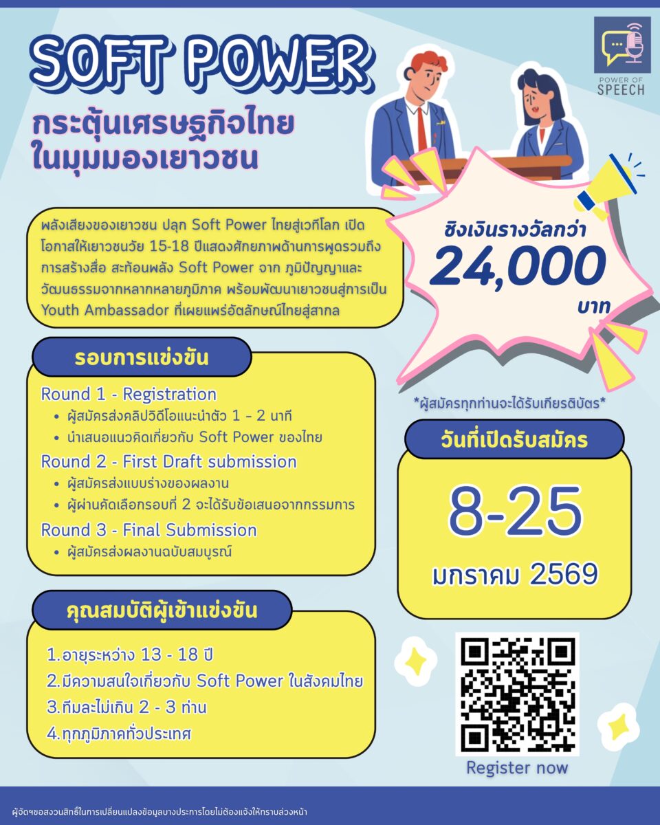 ร่วมเสนอไอเดียของคุณ ว่าเราจะนำ Soft Power ของไทย มาต่อยอดเพื่อขับเคลื่อนเศรษฐกิจได้อย่างไร ถ่ายทอดในรูปแบบใดก็ได้ที่คุณถนัด ไม่ว่าจะเป็น สุนทรพจน์ วิดีโอ หรืออินโฟกราฟิก ชิงรางวัลรวมมูลค่ากว่า 24,000 บาท