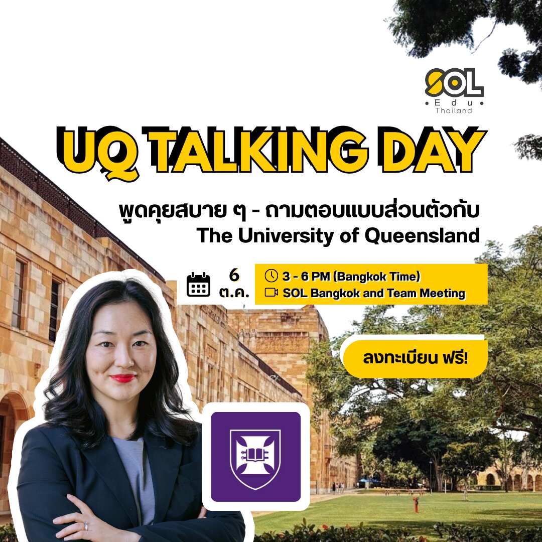พูดคุยและปรึกษาแบบตัวต่อตัวกับคุณ Jinny Yun ตัวแทนจาก The University of Queensland สอบถามข้อมูลคอร์สเรียนที่คุณสนใจ ค่าเทอม ทุนการศึกษา และเกณฑ์การรับเข้า ฟรีตลอดทั้งกิจกรรม!