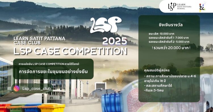 ขอเชิญชวนนักเรียนระดับชั้นมัธยมศึกษาตอนปลายเข้าร่วม LSP Case Competition ในโจทย์“การจัดขยะในชุมชนอย่างยั่งยืน” เปิดโอกาสให้เยาวชนได้เปลี่ยนไอเดียให้เป็นนวัตกรรมพร้อมกับชิงรางวัลไปพร้อมๆกัน