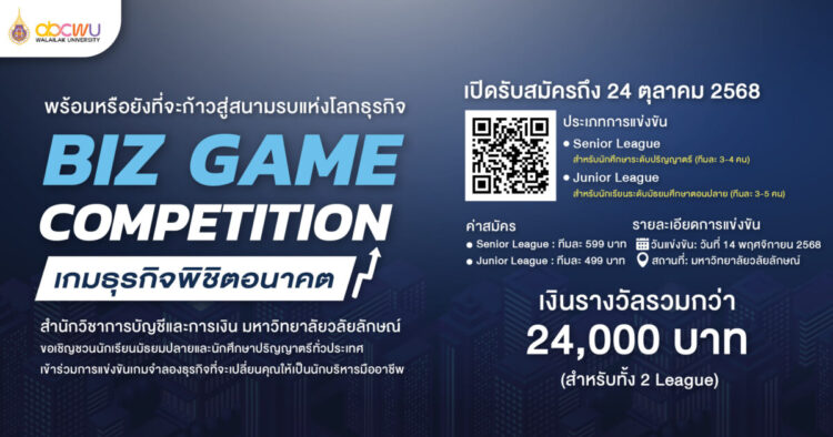พร้อมหรือยังที่จะก้าวสู่สนามรบแห่งโลกธุรกิจ? สำนักวิชาการบัญชีและการเงิน มหาวิทยาลัยวลัยลักษณ์ ขอเชิญชวนนักเรียนมัธยมปลายและนักศึกษาปริญญาตรีทั่วประเทศเข้าร่วม BIZ Game Competition