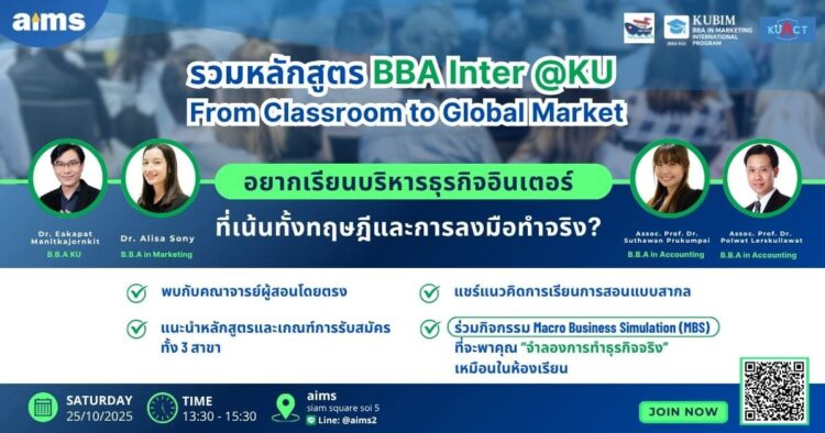 พบกับคณาจารย์ผู้สอนที่จะมาแนะนำหลักสูตรและเกณฑ์การรับทั้ง 3 สาขา Business and Finance (BBA KU), Marketing (KUBIM), Accounting (KUACT) พร้อมกิจกรรมสุด Exclusive!