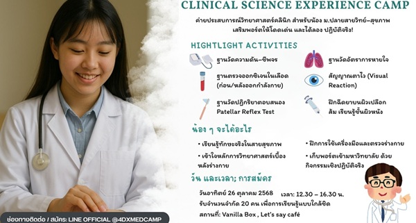 ค่ายประสบการณ์วิทยาศาสตร์คลินิก สำหรับน้อง ม.ปลายสายวิทย์–สุขภาพ เสริมพอร์ตให้โดดเด่น และได้ลอง ปฏิบัติจริง!