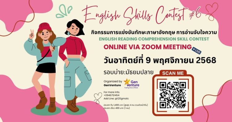 เวทีแห่งการท้าทายความสามารถด้านการอ่านภาษาอังกฤษ (Reading Comprehension Skill) ฝึกคิดวิเคราะห์ พัฒนาทักษะ และคว้าโอกาสสู่ความสำเร็จ พร้อมเกียรติบัตรและถ้วยรางวัลกำลังรอคุณอยู่!