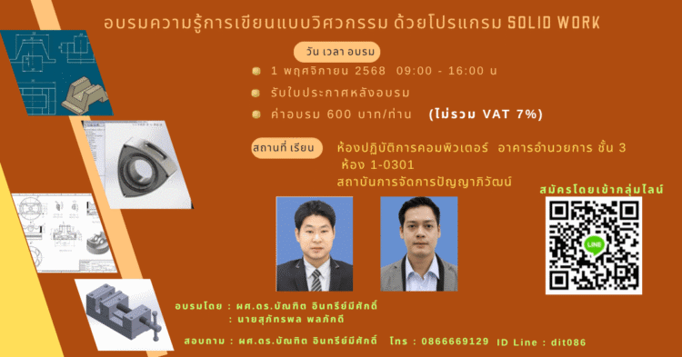 ช่วงปิดเทอมน้องๆ สามารถเพิ่มเติมความรู้ด้านวิศวกรรมในหัวข้อ "ความรู้การเขียนแบบวิศวกรรมด้วยโปรแกรม SOLID WORK" อบรม 1 พฤศจิกายน 2568 รับใบประกาศหลังอบรม ค่าอบรม 600 บาท/ท่าน (ไม่รวม VAT 7%)