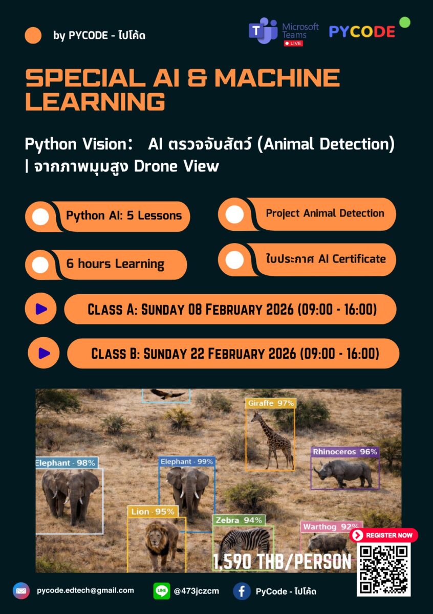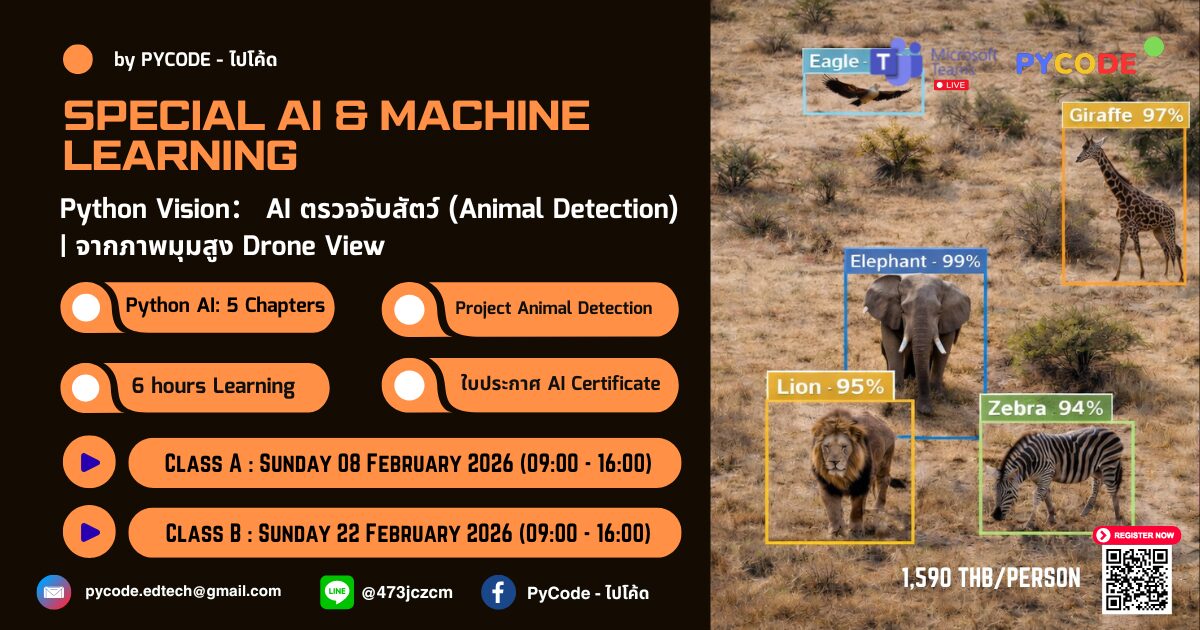🤖คอร์สสร้าง AI ลงมือทำจริง สร้างระบบตรวจจับสัตว์จากภาพมุมสูง Drone ด้วย YOLO รุ่นใหม่ล่าสุด ทำ Dataset บน Roboflow, เทรนบน Google Colab, และเข้าใจ Computer Vision แบบองค์กร Tech ระดับโลก 🚀