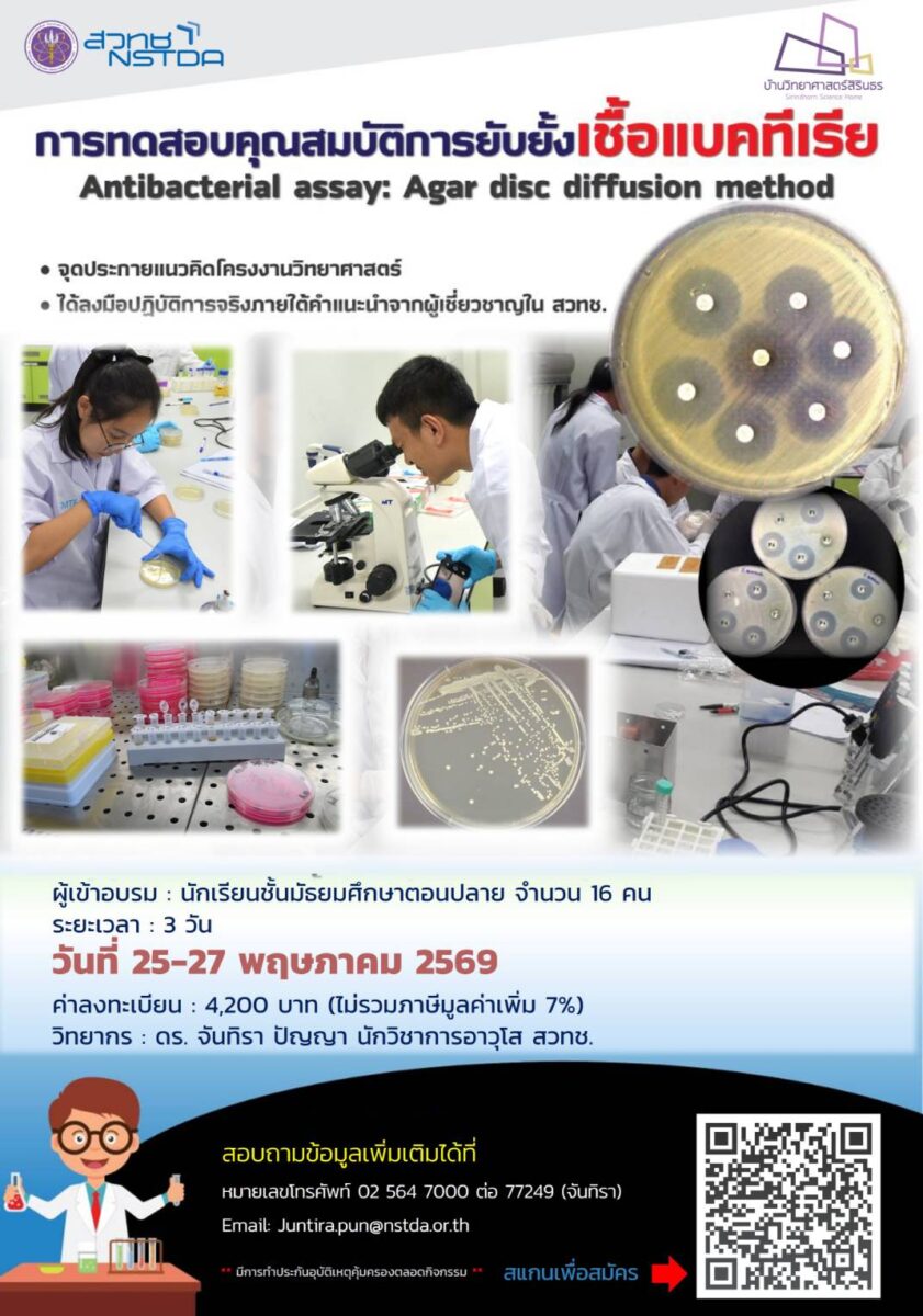 น้อง ๆ จะได้เรียนรู้และฝึกฝนทักษะทางด้านจุลชีววิทยาเรื่องการทดสอบคุณสมบัติการยับยั้งเชื้อแบคทีเรียทั้งภาคทฤษฎีและภาคปฏิบัติด้วยตนเองในห้องปฏิบัติการของบ้านวิทยาศาสตร์สิรินธร ภายใต้การดูแลของคณะนักวิชาการ สวทช. โดยเรียนรู้เกี่ยวกับความปลอดภัยในห้องปฏิบัติการจุลชีววิทยา เทคนิคปลอดเชื้อ เทคนิคการฆ่าเชื้อ และเทคนิคพื้นฐานต่างๆ ได้แก่ การเตรียมอาหารโดยผ่านการฆ่าเชื้อ การนับเชื้อ (Total plate count) การเจือจางตัวอย่างเชื้อ (Serial dilution) การเตรียมหัวเชื้อสำหรับทดสอบในอาหารเหลว และการทดสอบคุณสมบัติการยับยั้งเชื้อแบคทีเรีย