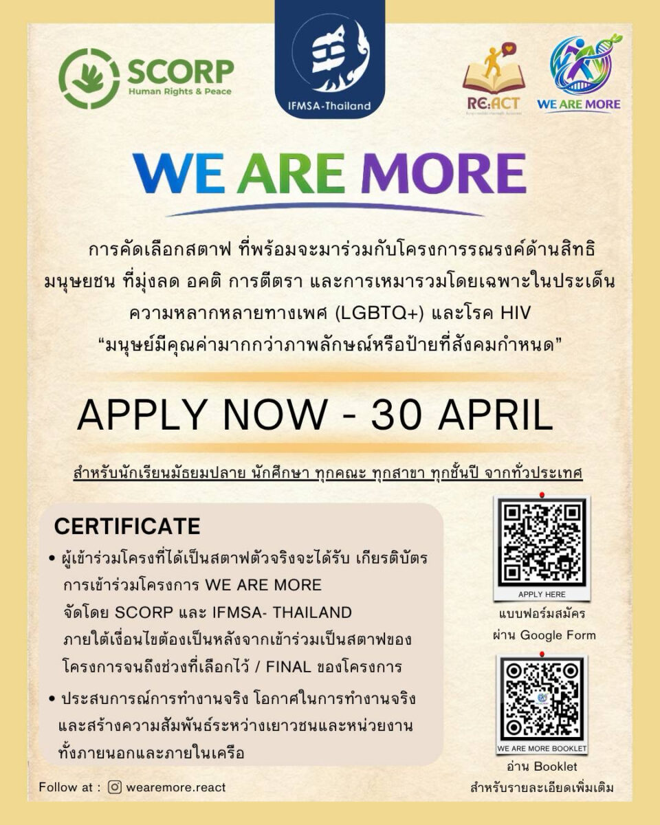 เปิดรับสมัคร STAFF โครงการ WE ARE MORE โครงการรณรงค์ด้านสิทธิมนุษยชน ที่มุ่งลดอคติ การตีตรา และการเหมารวม โดยเฉพาะในประเด็นความหลากหลายทาง เพศ (LGBTQ+) และโรค HIV 💙