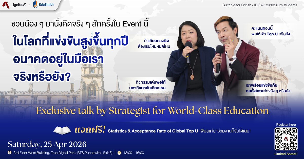 ที่จะมาเผยกลยุทธ์นี้โดย ดร.พี่กั๊ก School Director จาก Ignite A* และ Special Guest ที่วางกลยุทธ์ให้เด็กสอบติดมหาวิทยาลัยระดับโลกมาแล้วเกือบ 10 ปี!