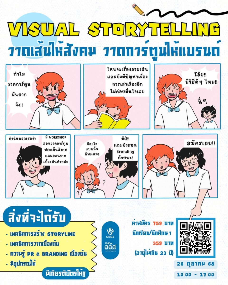 เพราะศิลปะคือสิ่งที่ทุกคนสามารถเข้าถึงได้ พบกับ “Visual Storytelling : วาดเส้นให้สังคม วาดการ์ตูนให้แบรนด์“ Workshop จาก SYSI School ที่จะพาทุกคนมาฝึกการเป็นนักเขียนการ์ตูนเพื่อสื่อสารประเด็นสังคมไปด้วยกัน พาทุกคนไปเรียนรู้เทคนิคการวาดเบื้องต้น รวมถึงความรู้ด้าน PR & Branding พื้นฐาน ที่บอกเลยว่าไม่ยากอย่างที่คิดแน่นอน!!