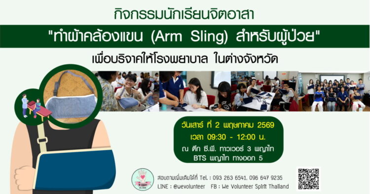 ขอเชิญน้องๆระดับชั้นมัธยมเข้าร่วมกิจกรรมกิจกรรมนักเรียนจิตอาสา “ทำผ้าคล้องแขน” (Arm Sling ) สำหรับผู้ป่วย วันเสาร์ ที่ 2 พฤษภาคม 2569 เวลา 13.00-15.30 น.