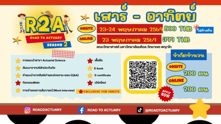 ถึงเวลาแล้วสำหรับน้องๆที่สนใจในสาขาคณิตศาสตร์ประกันภัย มาค้นหาคำตอบไปด้วยกัน! ค่าย The 11th Road to Actuary พร้อมพาทุกคนออกเดินทางไปกับของเล่น เรียนรู้คณิตศาสตร์ทั้งทฤษฎีและการประยุกต์ใช้งาน