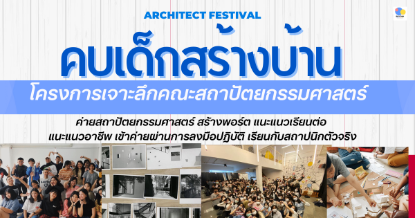 ค่ายเจาะลึกคณะสถาปัตยกรรมศาสตร์ ปูเส้นทางเรียนต่อในมหาลัย แนะแนวทั้งภาคไทยและอินเตอร์ ได้ผลงานใส่พอร์ต ได้เรียนกับพี่สถาปนิกตัวจริง ได้ใบประกาศ พร้อมรูปถ่าย