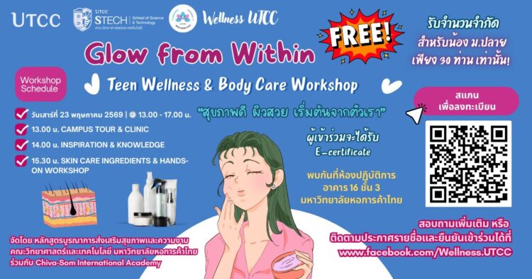 โอกาสทองของน้องมัธยมปลาย ปวช. มาแล้ว! ใครอยากมีผิวสวย สุขภาพดีจากภายในสู่ภายนอก พร้อมเส้นทางอาชีพสาย Wellness ระดับโลก และ workshop Skincare product ได้รับ e-Certificate จำกัดเพียง 30 ท่าน