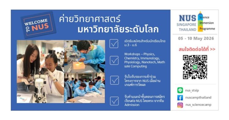 ร่วมค่ายวิทยาศาสตร์กับ NUS มหาวิทยาลัยอันดับ 1 ของเอเชีย/ อันดับ 8 ของโลก รับ NUS Certificate เมื่อผ่านเกณฑ์จบหลักสูตร นำใส่พอร์ตสายวิทย์ทุกสาขาเพื่อยื่นเข้ามหาวิทยาลัยทั้งในและต่างประเทศ