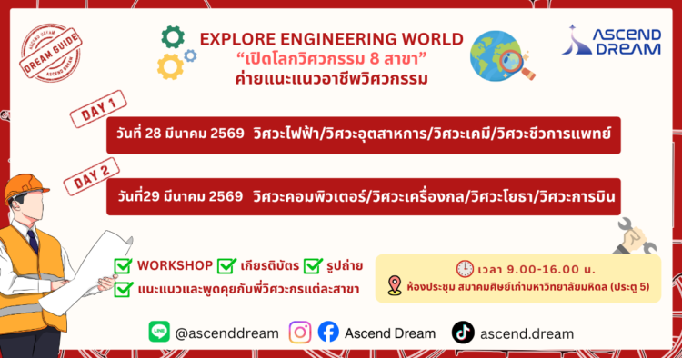 ถ้ายังไม่แน่ใจว่า "วิศวะ" ใช่ทางของเราไหม? ค่ายนี้จะพาน้องๆไปเห็นของจริง ก่อนตัดสินใจอนาคต เปิดโลกวิศวะผ่านประสบการณ์จริง ได้รู้จักหลายสาขา ลองคิด ลองทำ กับพี่วิศวกร 8 สาขา