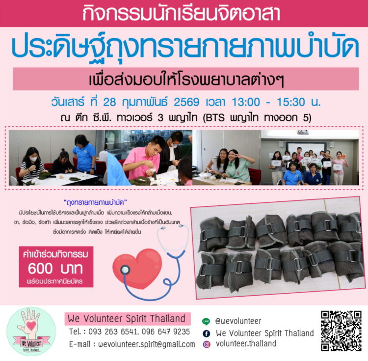 ขอเชิญน้องๆ และผู้สนใจเข้ารวมกิจกรรมนักเรียนจิตอาสา “ประดิษฐ์ถุงทรายกายภาพบำบัด” วันเสาร์ ที่ 28 กุมภาพันธ์ 2569 เวลา 13.00-15.30 น.