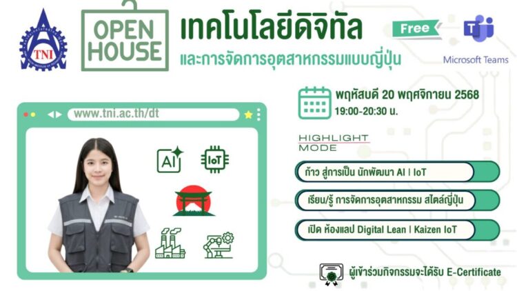 เปิดบ้านออนไลน์ สถาบันเทคโนโลยีไทย-ญี่ปุ่น (TNI) พบหลักสูตรสุดล้ำ AI, IoT, และการจัดการแบบญี่ปุ่น เรียนรู้ Digital Lean และ Kaizen IoT พร้อมรับ E-Certificate!