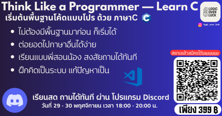 เริ่มต้นเขียนโปรแกรมด้วยภาษา C วางรากฐานการเป็นโปรแกรมเมอร์ เรียนรู้ตั้งแต่โครงสร้าง คำสั่ง ไปจนถึงการคิดเชิงตรรกะ