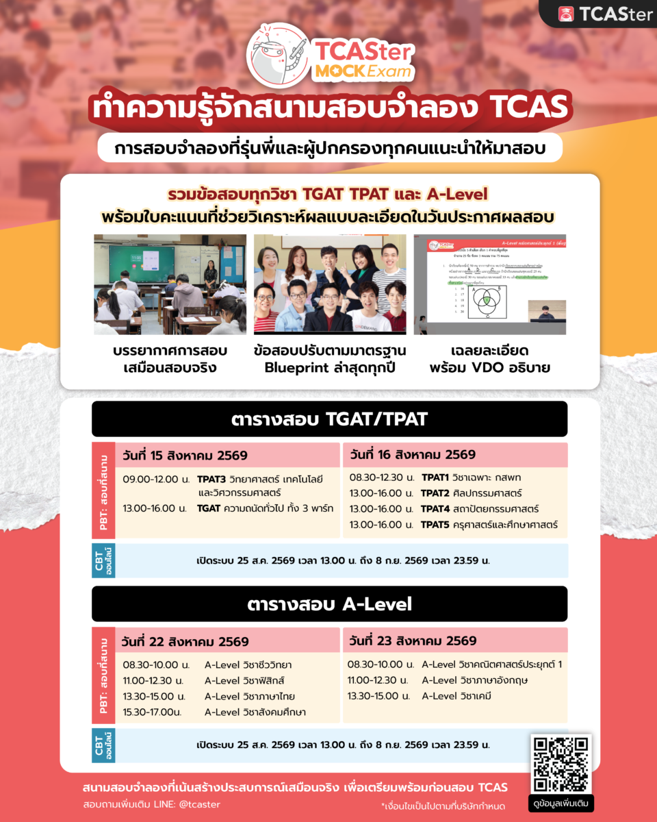 การสอบจำลองมีทั้งการสอบที่สนามสอบและสอบแบบออนไลน์ *รูปแบบการสอบที่สนามมีที่นั่งจำกัด ดูรายละเอียดที่ TCASter MOCK Exam