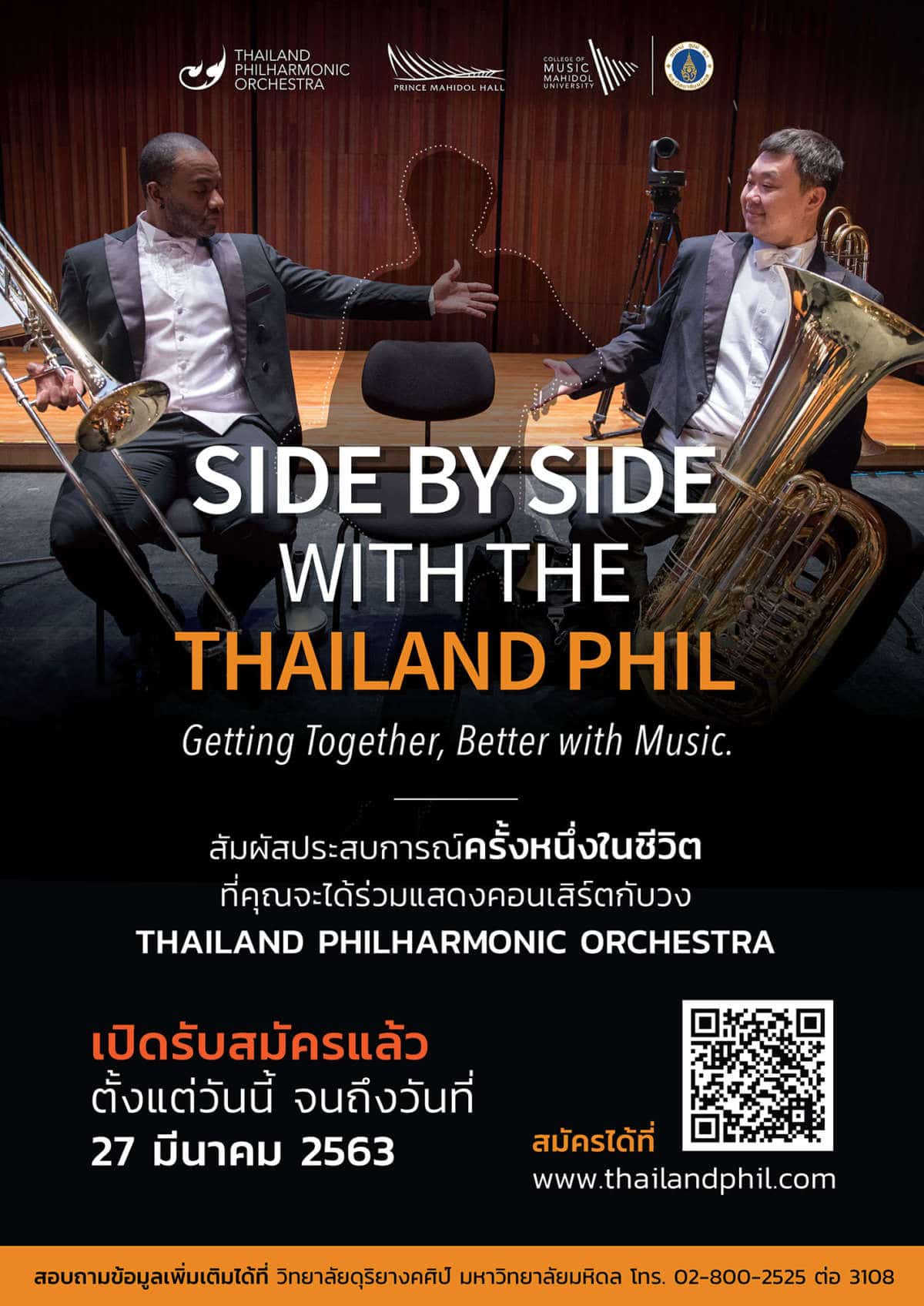 หากคุณมีความฝัน ที่จะได้ร่วมเล่นดนตรีในวงออร์เคสตราอาชีพ รักการเล่นดนตรี หรือกำลังศึกษาด้านการแสดงดนตรี วง Thailand Philharmonic เปิดโอกาสให้คุณได้มาร่วมเล่นกับเราในโครงการ SIDE BY SIDE WITH THE THAILAND PHIL ภายใต้แนวคิด “Getting Together, Better with Music” โดยกิจกรรมคอนเสิร์ตจะจัดขึ้นในวันที่ 13-14 มิถุนายน 2563 ณ หอแสดงดนตรีมหิดลสิทธาคาร (Prince Mahidol Hall)