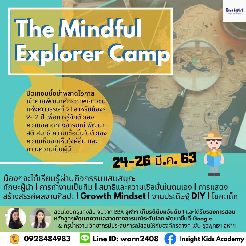 ?ปิดเทอมนี้เชิญน้องๆตั้งแต่ 9-12 ปีมาเข้าร่วมกิจกรรม Insight Kids: The Mindful Explorer Camp?วันที่ 24-26 มี.ค. 63 เพื่อเพิ่มทักษะในการฝึกสติและ พัฒนาความฉลาดทางอารมณ์ (EQ) และ Growth Mindset สนุกกับกิจกรรมหลากหลาย ที่ช่วยเสริมศักยภาพให้เติบโตทั้งร่างกายและจิตใจ ?