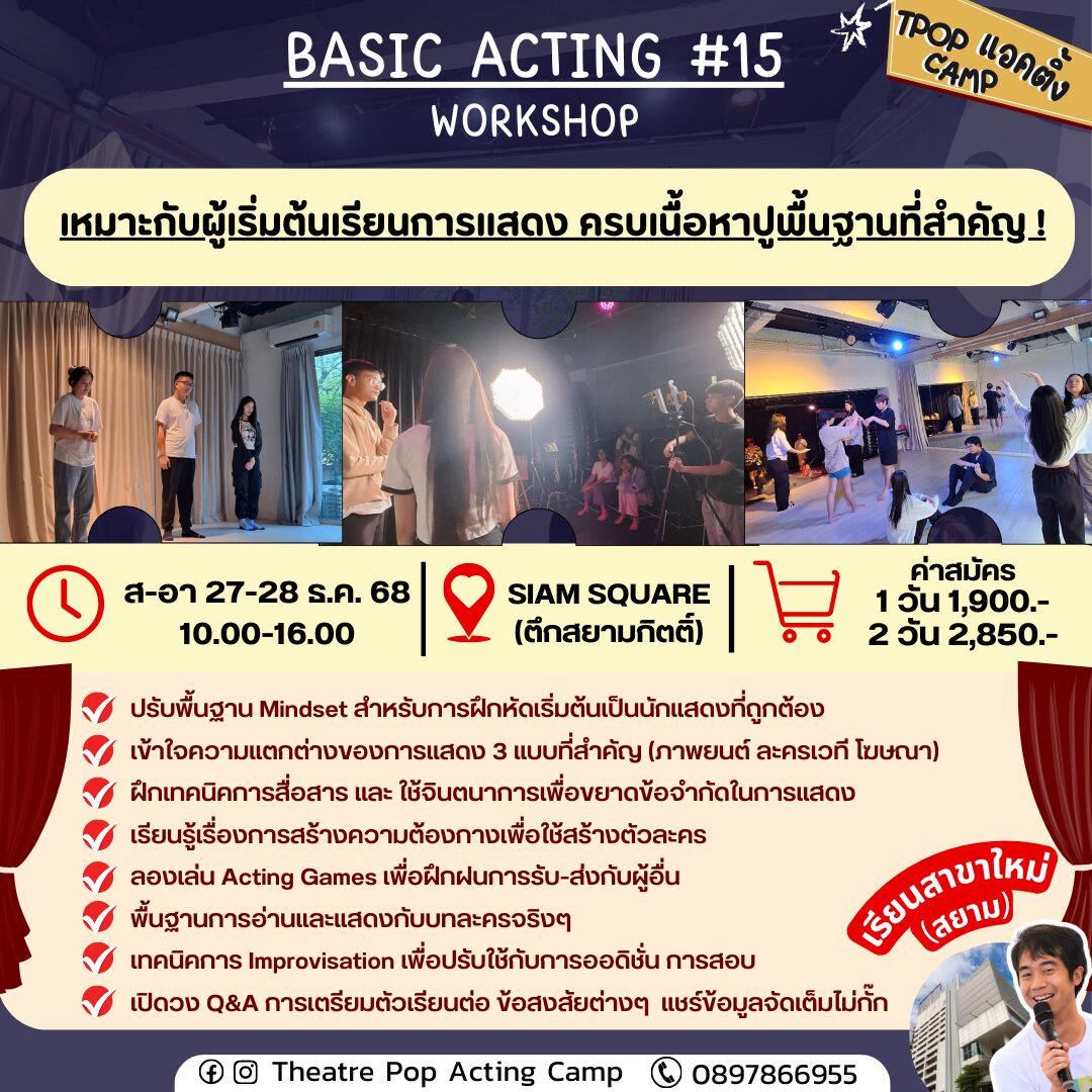 – วันที่ 27 ธ.ค. : ปรับพื้นฐาน Mindset การเป็นนักแสดง ฝึกทักษะจินตนาการ ความต้องการ การรับ-ส่ง ความเชื่อ การใช้ร่างกาย ฯลฯ