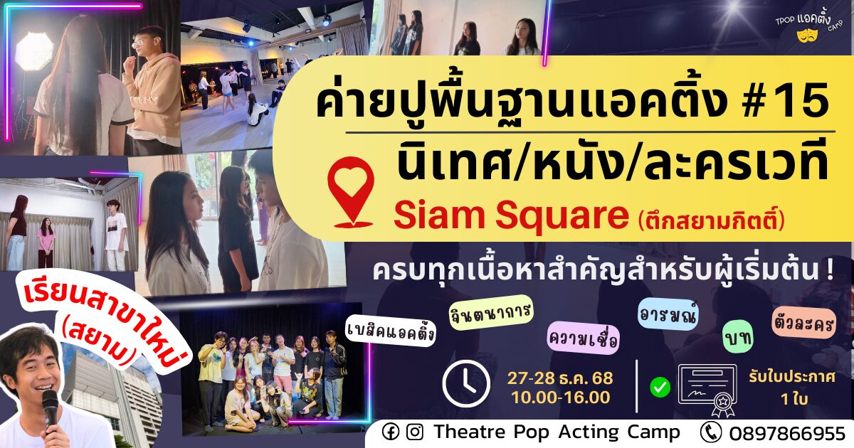 – วันที่ 27 ธ.ค. : ปรับพื้นฐาน Mindset การเป็นนักแสดง ฝึกทักษะจินตนาการ ความต้องการ การรับ-ส่ง ความเชื่อ การใช้ร่างกาย ฯลฯ