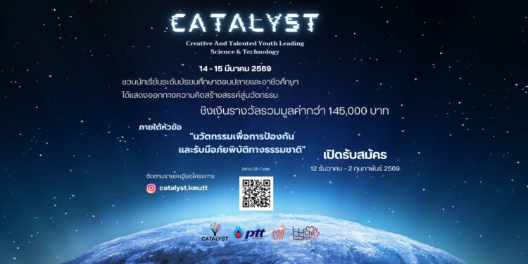 CATALYST คือการแข่งขันนวัตกรรมสำหรับนักเรียนมัธยมปลายและอาชีวศึกษา เปิดโอกาสให้นำวิทยาศาสตร์และเทคโนโลยีมาสร้างไอเดียเพื่อรับมือภัยพิบัติ พร้อมพัฒนาแนวคิดและชิงเงินรางวัลรวมกว่า 145,000 บาท
