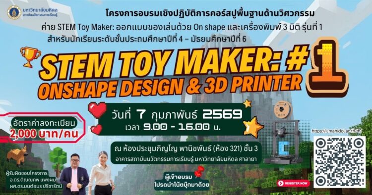 > สอนออกแบบโมเดลด้วยโปรแกรม Onshape > ปริ๊นโมเดลด้วย 3D printer > น้อง ๆ จะได้รับโมเดลที่ออกแบบเองกลับบ้านคนละ 1 ชิ้น > มีเกียรติบัตรให้หลังการอบรม