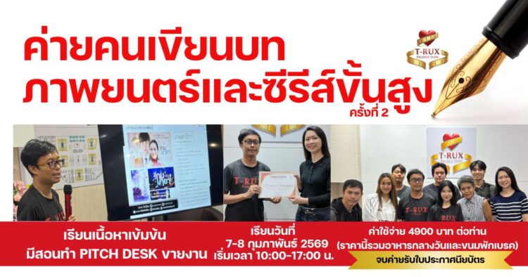 🎬 เปิดรับสมัครแล้ว! “ค่ายคนเขียนบท Advance Screenwriting Camp” โดย T-Rux Production ค่ายเขียนบทขั้นสูงครั้งที่ 2 ที่จะพาทุกคน ไปเรียนรู้ “เทคนิคการเขียนบทแบบมืออาชีพ”