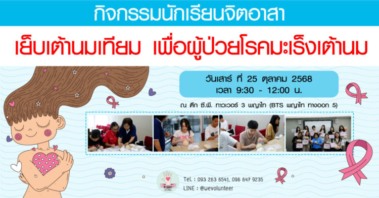 ขอเชิญน้องๆ ที่สนใจเข้าร่วมกิจกรรมนักเรียนจิตอาสา “เย็บเต้านมเทียมเพื่อผู้ป่วยมะเร็งเต้านม” วันเสาร์ ที่ 25 ตุลาคม 2568 เวลา 09.30-12.00 น.