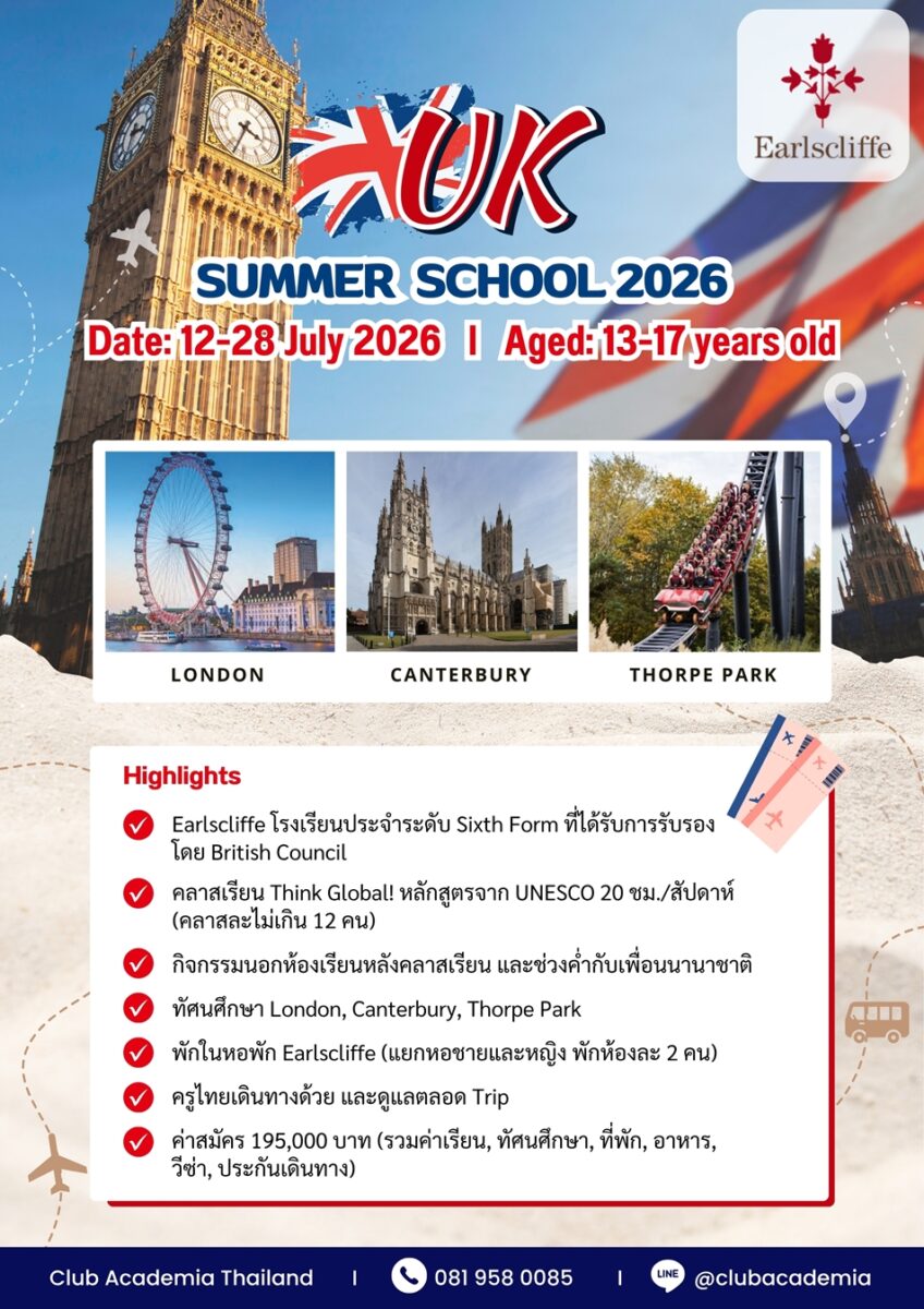 ซัมเมอร์แคมป์สำหรับนักเรียนอินเตอร์อายุ 13-17 ปี ที่ Earlscliffe School สหราชอาณาจักร วันที่ 12-28 กรกฎาคม 2569 นักเรียนจะได้เรียนภาษาอังกฤษ โปรแกรม Think Global! และทำกิจกรรมร่วมกับเพื่อนๆ จากทั่วโลก อีกทั้งยังได้ทัศนศึกษาในเมืองต่างๆ นักเรียนจะได้ฝึกทักษะการใช้ชีวิตในต่างแดน เช่น การแก้ปัญหา การตัดสินใจ การรู้จักปรับตัว การทำงานร่วมกับผู้อื่น เป็นต้น