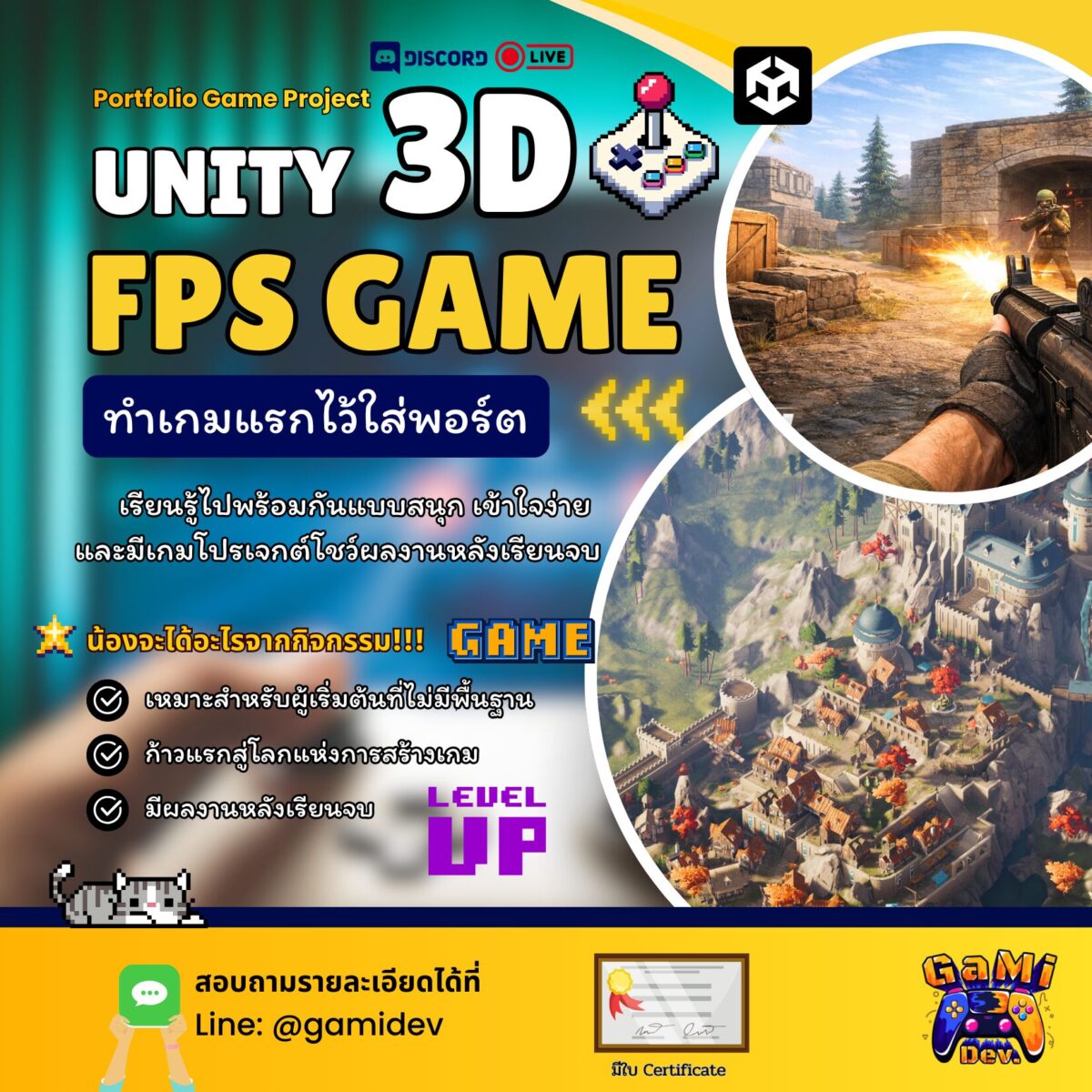 คอร์สเรียนสดออนไลน์ผ่าน Discord ที่ออกแบบมาสำหรับผู้เริ่มต้นจริง ไม่จำเป็นต้องมีพื้นฐาน Unity หรือการเขียนโปรแกรมมาก่อน เริ่มตั้งแต่การติดตั้ง Unity Hub, การสร้างโปรเจกต์, การใช้งานเครื่องมือภายใน Unity Editor เช่น Scene, GameObject, Terrain Tool รวมไปถึงการ Import และจัดการ Asset เพื่อสร้างฉากเกม 3D อย่างเป็นขั้นตอน ตลอดระยะเวลาเรียน 11 ครั้ง ครั้งละ 2 ชั่วโมง ผู้เรียนจะได้ลงมือทำโปรเจกต์เกม FPS (First-Person Shooter) ของตัวเอง พร้อมเมนูและการ Build เกมเล่นได้จริง 🎮