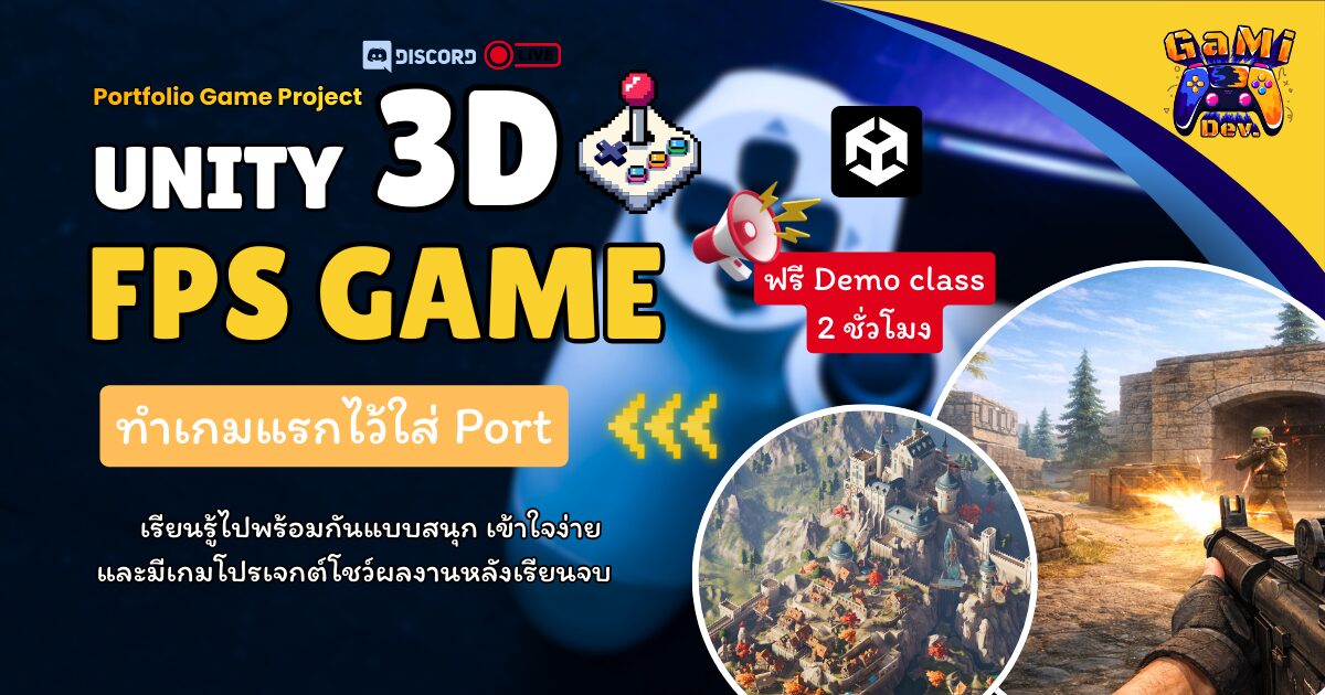 คอร์สเรียนสดออนไลน์ผ่าน Discord ที่ออกแบบมาสำหรับผู้เริ่มต้นจริง ไม่จำเป็นต้องมีพื้นฐาน Unity หรือการเขียนโปรแกรมมาก่อน เริ่มตั้งแต่การติดตั้ง Unity Hub, การสร้างโปรเจกต์, การใช้งานเครื่องมือภายใน Unity Editor เช่น Scene, GameObject, Terrain Tool รวมไปถึงการ Import และจัดการ Asset เพื่อสร้างฉากเกม 3D อย่างเป็นขั้นตอน ตลอดระยะเวลาเรียน 11 ครั้ง ครั้งละ 2 ชั่วโมง ผู้เรียนจะได้ลงมือทำโปรเจกต์เกม FPS (First-Person Shooter) ของตัวเอง พร้อมเมนูและการ Build เกมเล่นได้จริง 🎮